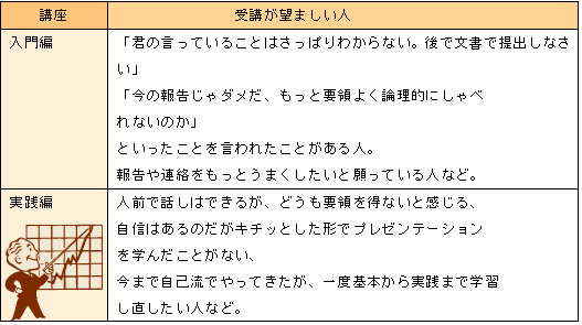 実践プレゼンテーション中心。わかりやすく、かつインパクトをもって説得するスキルを学ぶ。